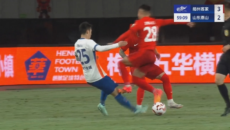 梅州客家3-4山東泰山 鐘浩然跳起搶斷,鞋底踩彭欣力膝蓋直紅下場(chǎng)↓