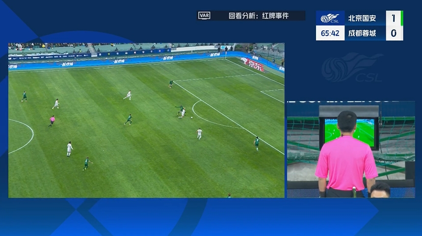 北京國(guó)安本輪的對(duì)手是成都蓉城,比賽下半時(shí)國(guó)安后防核心恩加德烏后場(chǎng)拿球失誤,隨即又放倒了前來(lái)?yè)寯嗟馁M(fèi)利佩,當(dāng)值主裁馬寧在經(jīng)過(guò)VAR視頻回看后將恩加德烏罰下。