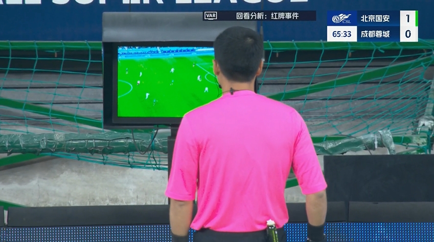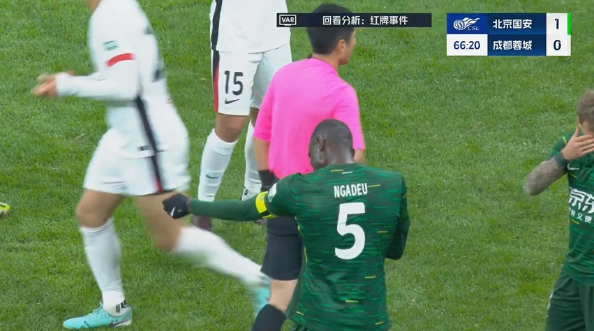 比賽第66分鐘,恩加德烏后場(chǎng)拿球被搶斷,無(wú)奈放倒費(fèi)利佩犯規(guī),主裁馬寧起初出示黃牌,隨后VAR介入,馬寧去場(chǎng)邊查看后改判直紅!場(chǎng)上比分國(guó)安1-0蓉城。
