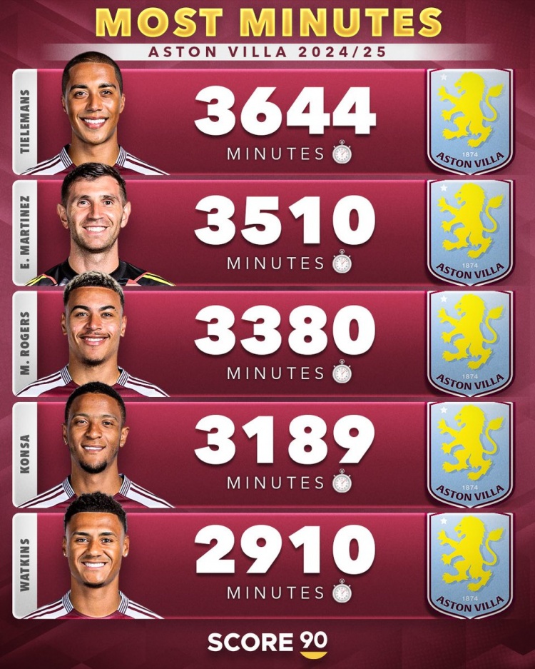 歐冠8強球隊本賽季出勤排名(所有賽事)