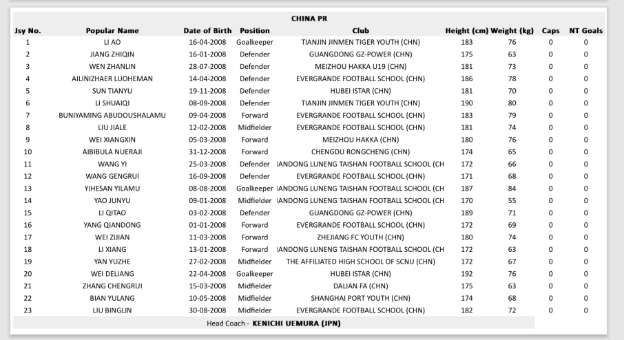 03月29日訊 亞足聯(lián)官方公布U17亞洲杯各隊23人名單,中國隊名單中艾比布拉領(lǐng)銜,魏祥鑫、布尼亞明在列。這支U17國足由上村健一掛帥,球隊近期共踢了4場熱身賽,均失利。