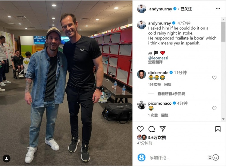 3月30日訊 德約科維奇現(xiàn)任教練、三座大滿(mǎn)貫得主穆雷更新社媒動(dòng)態(tài),曬出與梅西的合照。