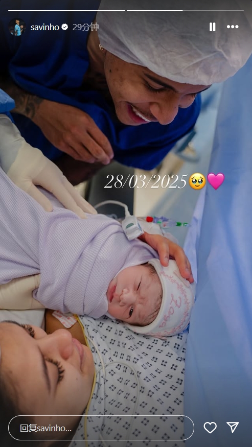 3月30日訊 曼城邊鋒薩維尼奧更新社媒動態(tài),慶祝孩子出生。