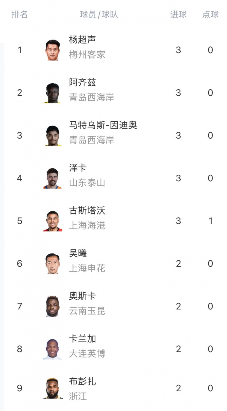 中超射手榜:楊超聲、澤卡、阿齊茲、馬特烏斯、古斯塔沃3球居首