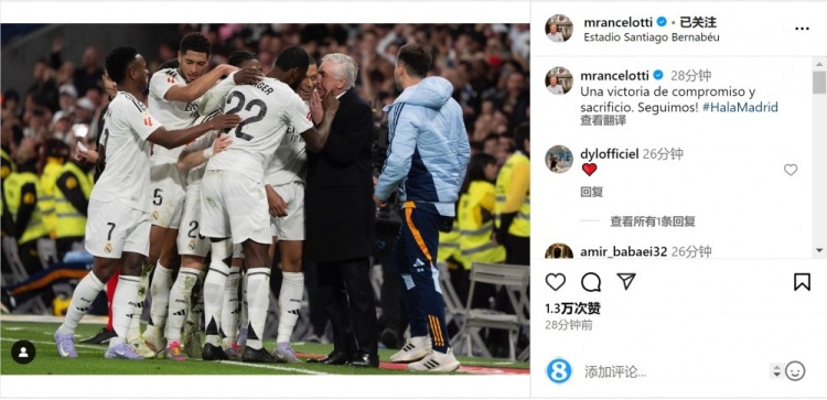 皇馬主帥安切洛蒂社媒曬出與球員們慶祝的照片,并配文:“一場(chǎng)奉獻(xiàn)和犧牲精神帶來的勝利,我們繼續(xù)前進(jìn)!”