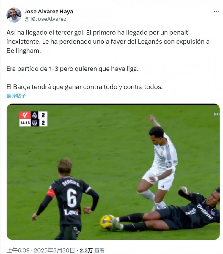 對(duì)此西班牙六臺(tái)巴薩跟隊(duì)記者Jose Alvarez Haya在社交媒體上寫道:“伯納烏的丑聞,判罰了一個(gè)不存在的點(diǎn)球(指居勒爾倒地獲點(diǎn))。”
