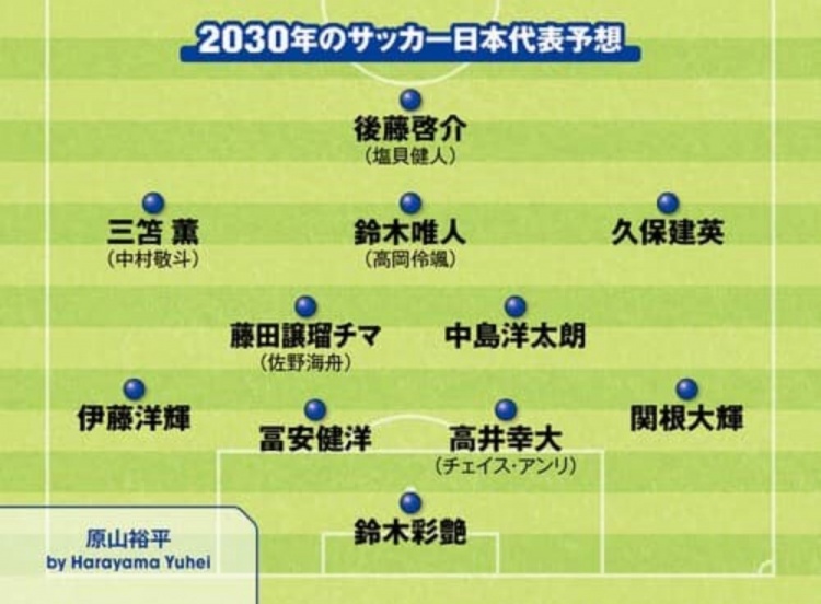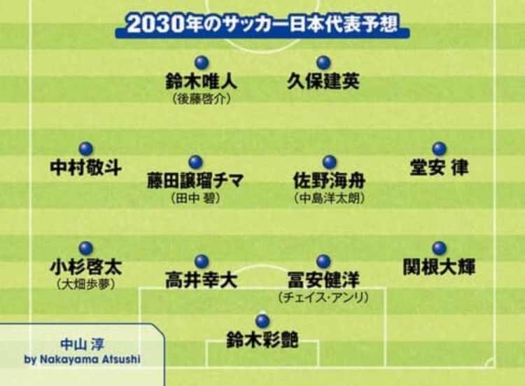 3月30日訊 據(jù)日媒Sportiva報道,近日該媒體開設(shè)專欄,開始對2030年世界杯日本隊首發(fā)陣容預測,有部分日本國內(nèi)的自由撰稿人投稿對首發(fā)進行預測。以上撰稿人預測的陣容中,基本都是本期日本國家隊陣中的年輕球員,并結(jié)合部分現(xiàn)役U22國家隊、U20國家隊球員等組合而成。
