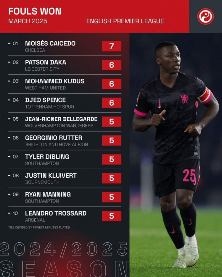 英超3月制造犯規(guī)次數(shù)榜:凱塞多7次居首,庫杜斯6次&特羅薩德5次