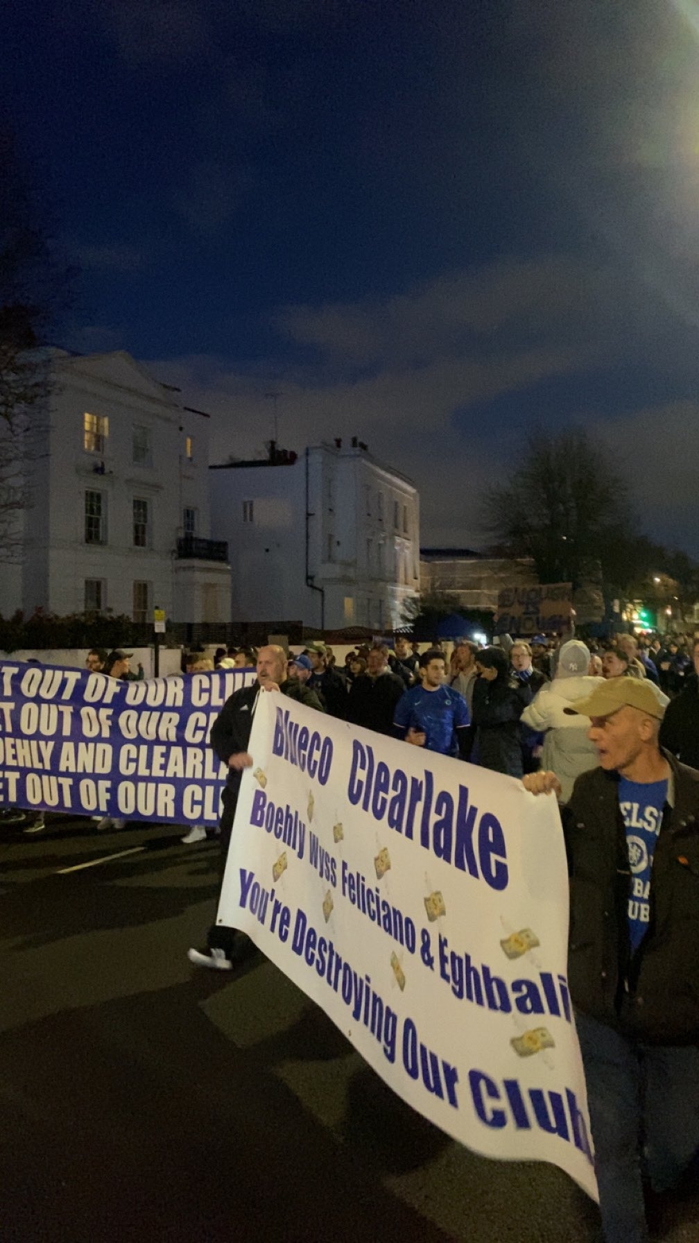 切爾西球迷在橫幅上寫著:伯利、埃格巴利、清湖資本離開切爾西,你們在摧毀我們的俱樂部!