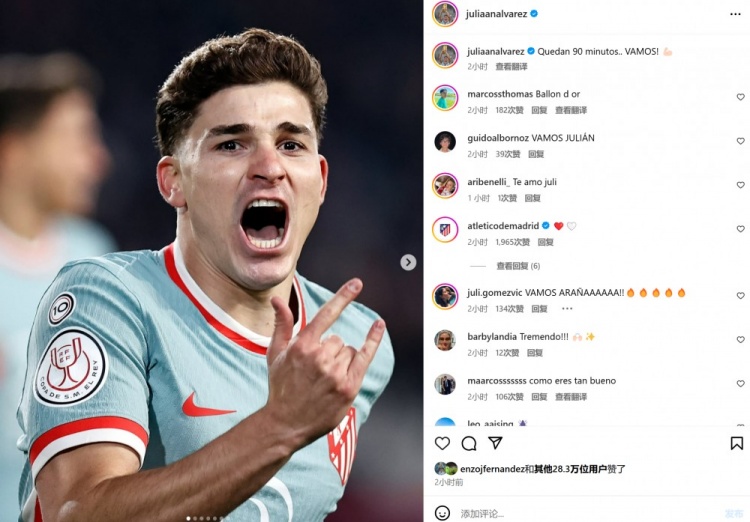 本場比賽阿爾瓦雷斯一傳一射表現(xiàn)出色,賽后他也在個人社媒曬出本場慶祝進球的照片,配文寫道:“還有90分鐘比賽,我們繼續(xù)加油!”