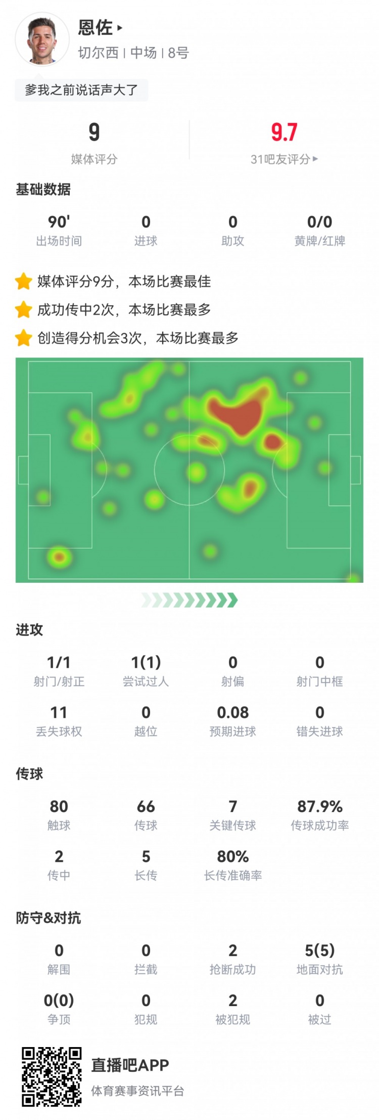 戰(zhàn)神!恩佐數(shù)據(jù):7次關(guān)鍵傳球,5次對抗全成功,評分9.0全場最高