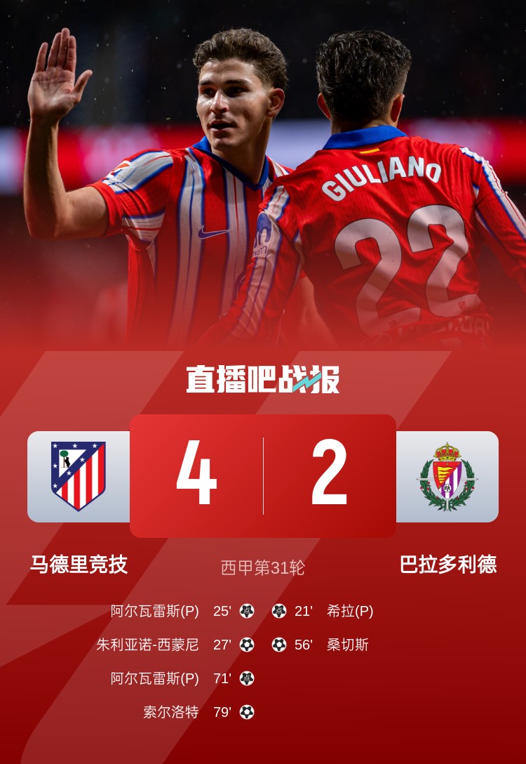 馬競(jìng)4-2逆轉(zhuǎn)巴拉多利德,阿爾瓦雷斯兩球,朱利亞諾-西蒙尼和索爾洛特破門。