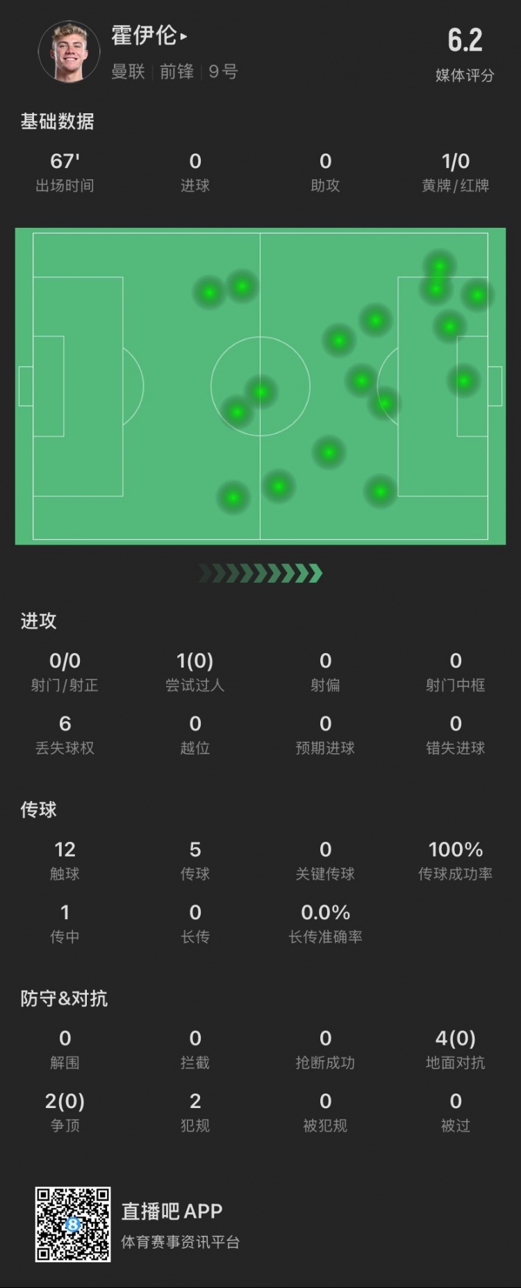 霍伊倫本場:射門關鍵傳球等數(shù)據(jù)掛零,6次對抗0成功,僅觸球12次