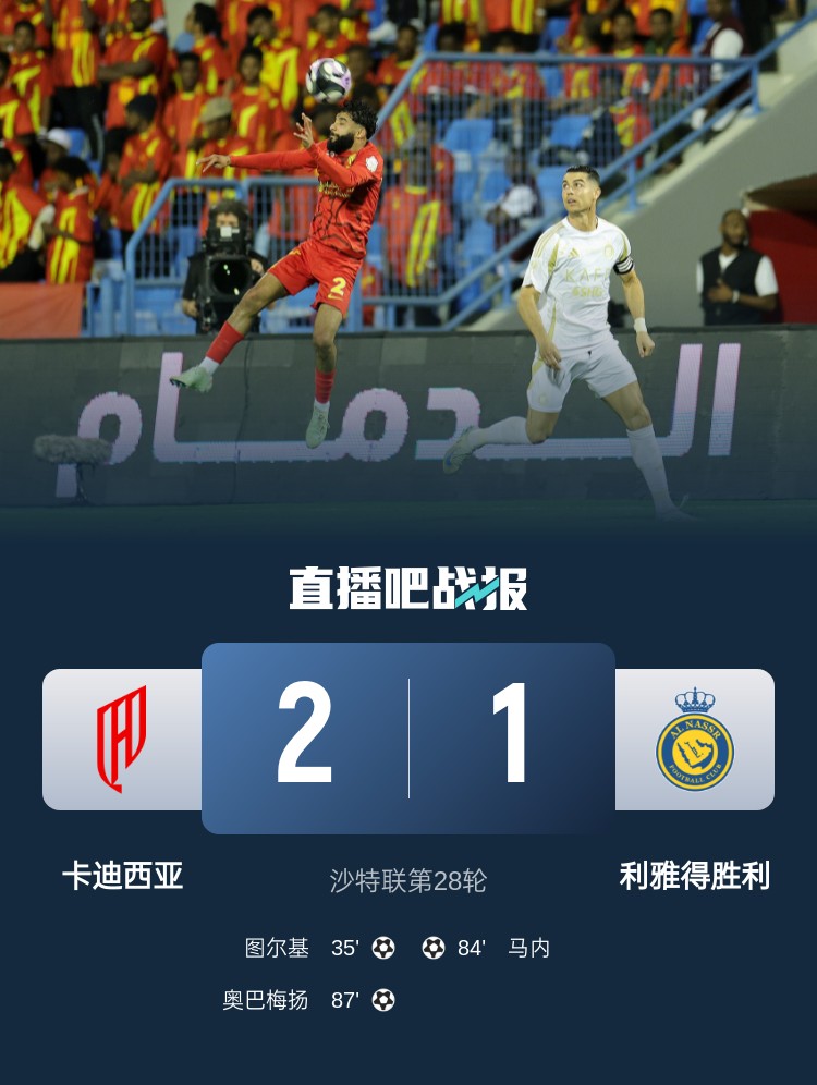 沙特聯(lián)第28輪,利雅得勝利客場1-2卡迪西亞,4輪不敗終結(jié)。上半場,圖爾基補射建功;下半場,杜蘭近距離失良機,馬內(nèi)84分鐘扳平比分,奧巴梅揚87分鐘絕殺。
