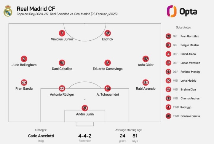 在皇馬首發(fā)陣容中同時排出了居勒爾、恩德里克以及維尼修斯,這還是三人在各項賽事中首次共同為皇馬先發(fā)出戰(zhàn)。