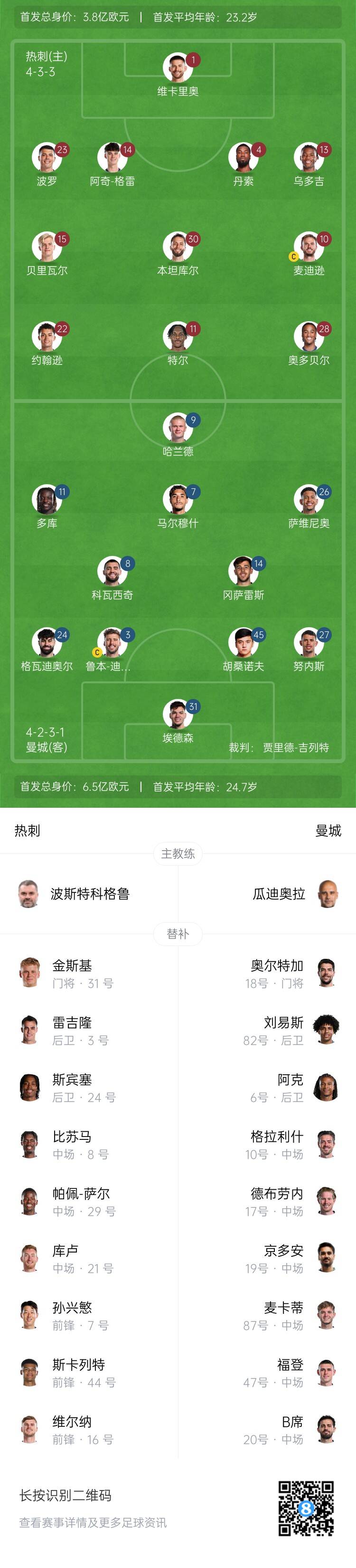 2月27日訊 英超第27輪,熱刺主場對陣曼城。賽前,官方公布了本場的首發(fā)名單。