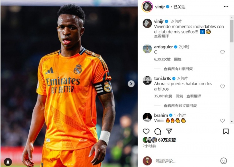 維尼修斯寫道:“與我夢想中的俱樂部一起經(jīng)歷難以忘懷的時刻!”