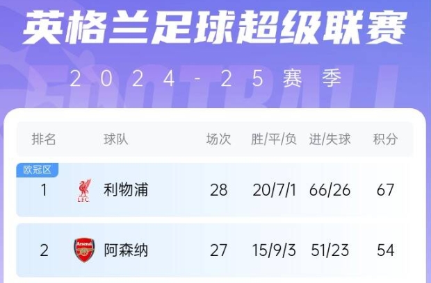 英超第27輪,阿森納客場0-0諾丁漢森林,利物浦2-0紐卡。阿森納目前少賽一場落后利物浦13分,奪冠希望渺茫。