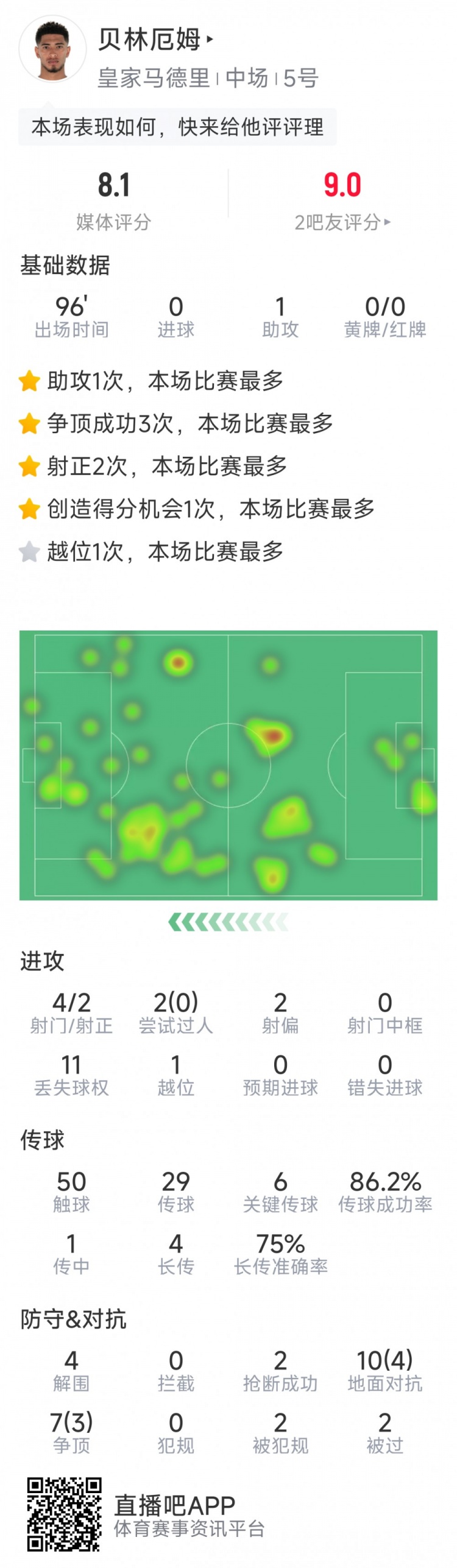 貝林厄姆本場數(shù)據(jù):1次助攻,6次關(guān)鍵傳球,4射2正