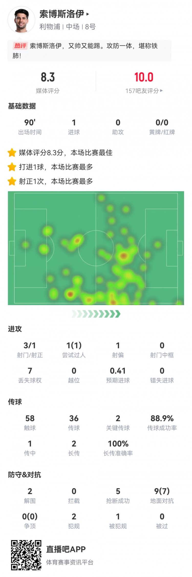 2月27日訊 本輪英超,利物浦2-0紐卡斯?fàn)?。此役索博斯洛伊首發(fā)打滿全場(chǎng)發(fā)揮出色,球員全場(chǎng)重點(diǎn)數(shù)據(jù)如下↓