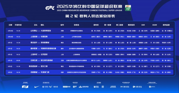 2月28日訊 中超官方公布中超第2輪裁判安排,麥麥提江將吹罰申花vs國(guó)安的焦點(diǎn)大戰(zhàn)。