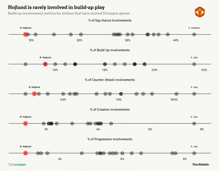 來(lái)自Footovision的數(shù)據(jù),進(jìn)一步突顯了霍伊倫在比賽中缺乏參與度。本賽季到目前為止,比賽首發(fā)過(guò)半數(shù)的英超前鋒中,霍伊倫的進(jìn)攻組織參與度只有1.3%,這突顯了他在進(jìn)攻組織階段幾乎是可有可無(wú)。