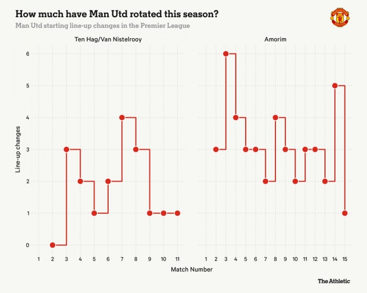 在對(duì)陣埃弗頓的比賽中,阿莫林的首發(fā)名單中只有一個(gè)位置進(jìn)行了調(diào)整,這也是他15場(chǎng)聯(lián)賽中調(diào)整最小的一次。