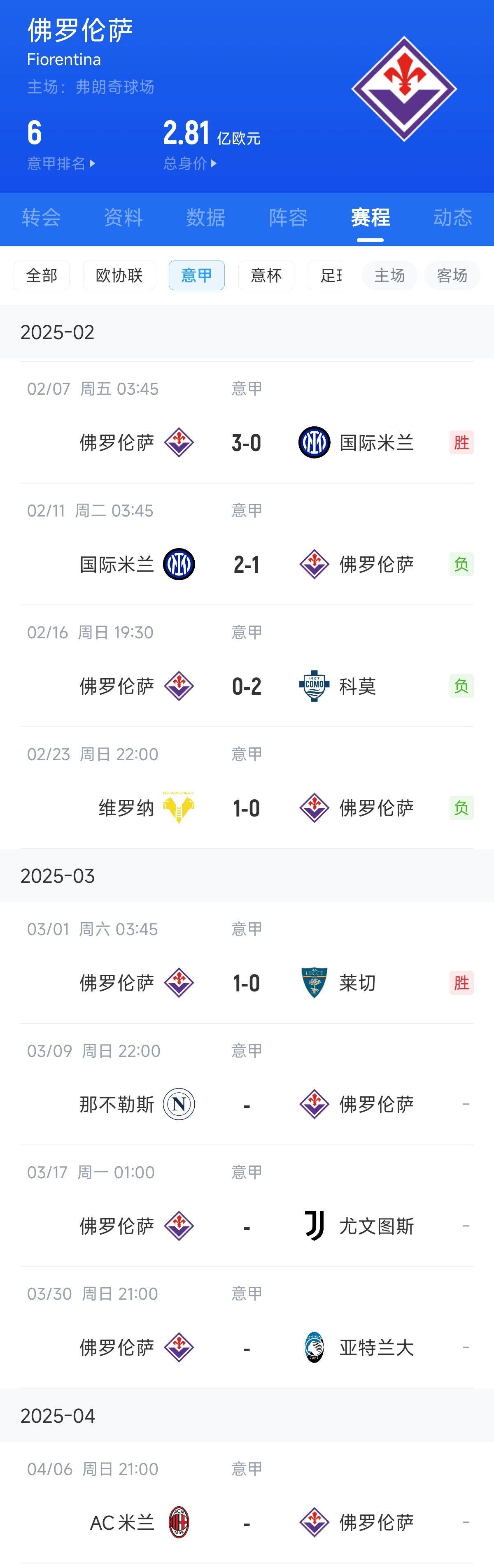 未來3輪佛羅倫薩將連續(xù)對陣意甲前4名中的那不勒斯(第2)、尤文圖斯(第4)和亞特蘭大(第3)。