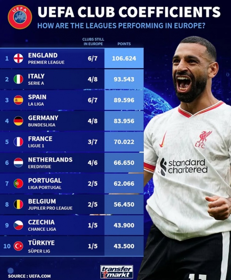2月22日訊 歐戰(zhàn)淘汰賽附加賽戰(zhàn)罷,歐足聯(lián)也更新了各大聯(lián)賽的五年歐戰(zhàn)積分情況,英超居首,意甲、西甲、德甲、法甲排名二到五位。