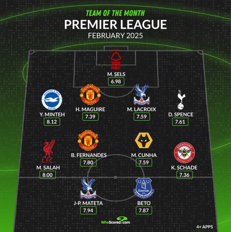 3月1日訊 英超2月比賽已經(jīng)完賽,whoscored也統(tǒng)計了本月評分最佳陣容,水晶宮和曼聯(lián)各2人入選。