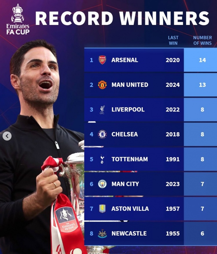 本屆BIG6僅剩曼市雙雄!足總杯歷史奪冠榜:阿森納14次、曼聯(lián)13次