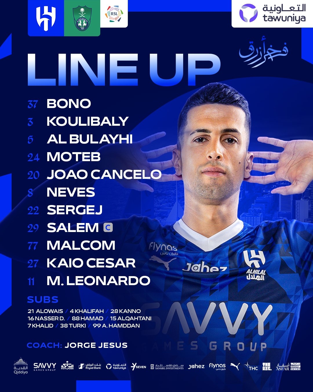 利雅得新月首發(fā):37-布努、3-庫利巴利、5-布萊希、24-穆塔卜-哈爾比、20-坎塞洛、8-魯本-內(nèi)維斯、22-米林科維奇、29-多薩里、77-馬爾科姆、27-利馬、11-萊昂納多