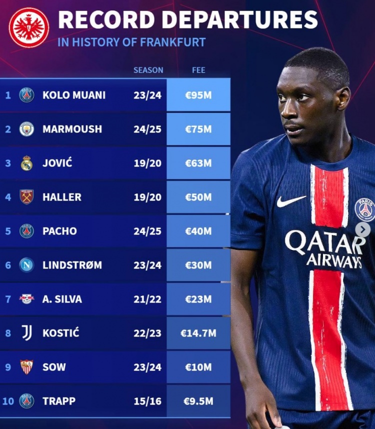 3月2日訊 《轉(zhuǎn)會市場》統(tǒng)計了法蘭克福隊史賣人最貴榜,穆阿尼以9500萬歐元居首。