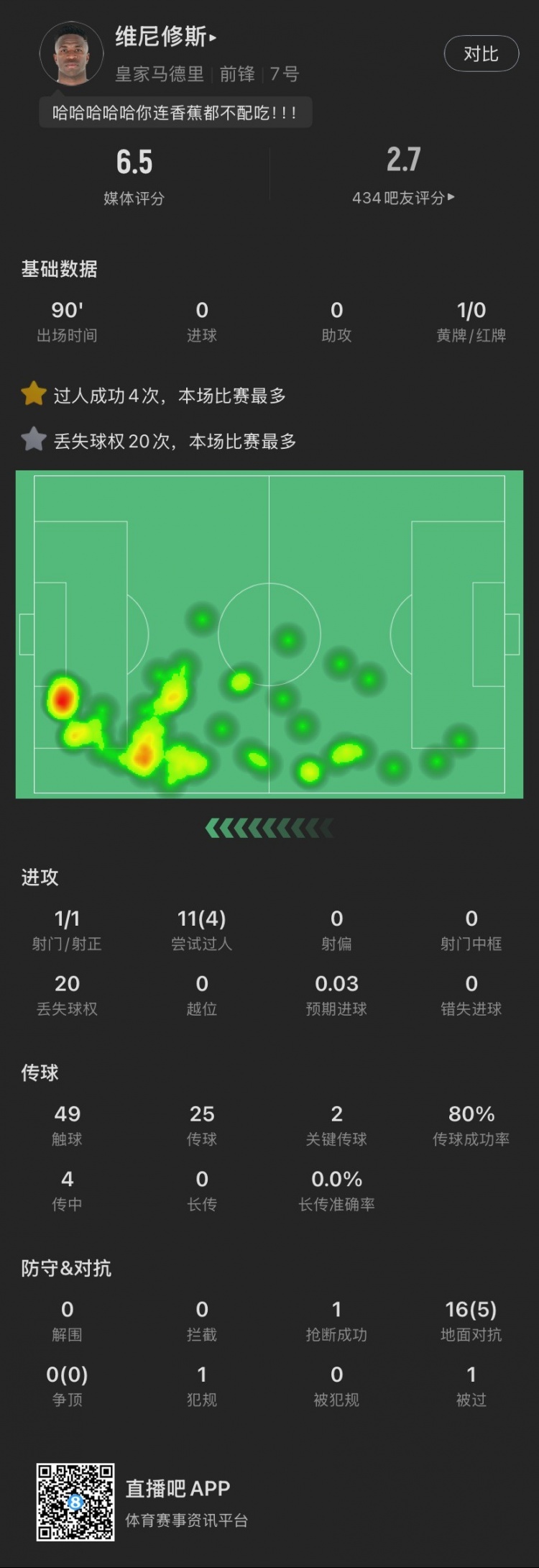 維尼修斯本場(chǎng)主要數(shù)據(jù)↓