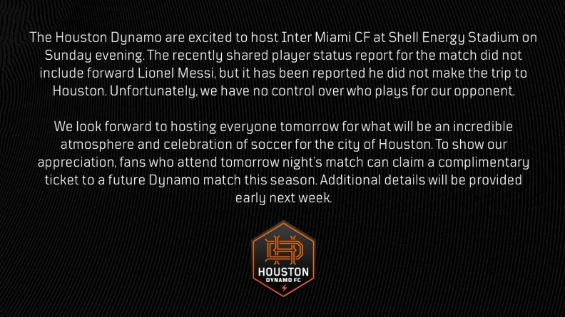休斯頓迪納摩俱樂部很高興能在周日晚上在主場迎戰(zhàn)邁阿密國際俱樂部。最近的比賽球員狀態(tài)報告中沒有梅西,據報道稱他沒有前往休斯頓。