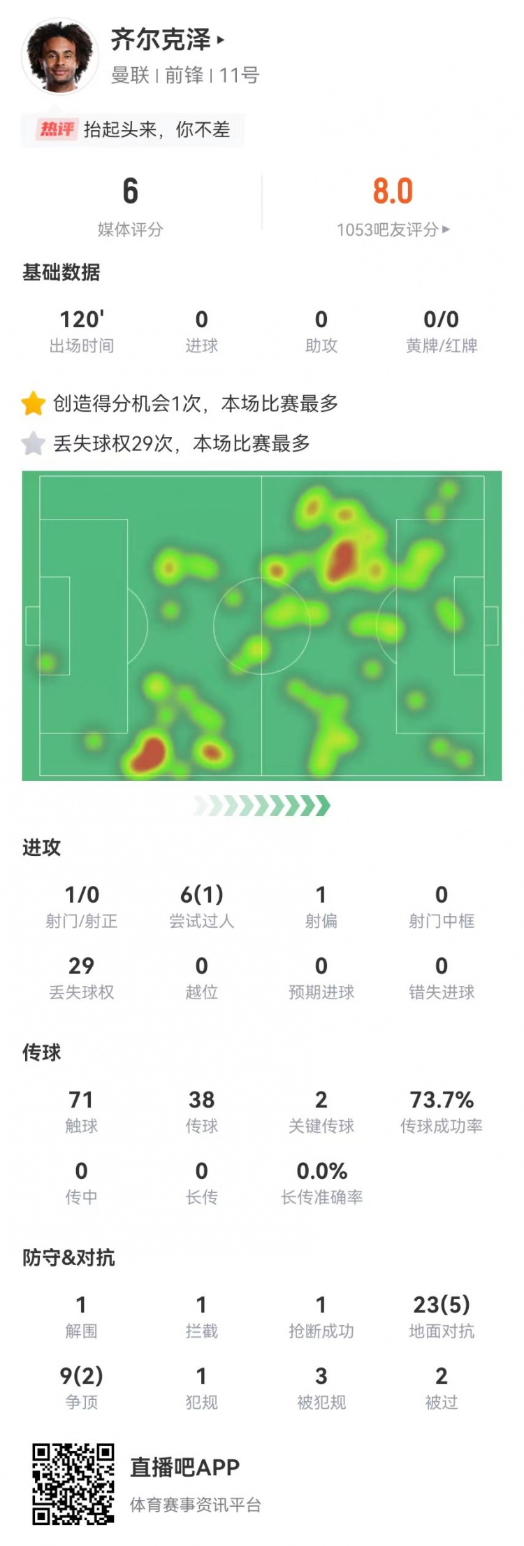 3月3日訊 曼聯(lián)在本輪足總杯被富勒姆點(diǎn)球淘汰,齊爾克澤本場(chǎng)數(shù)據(jù)如下: