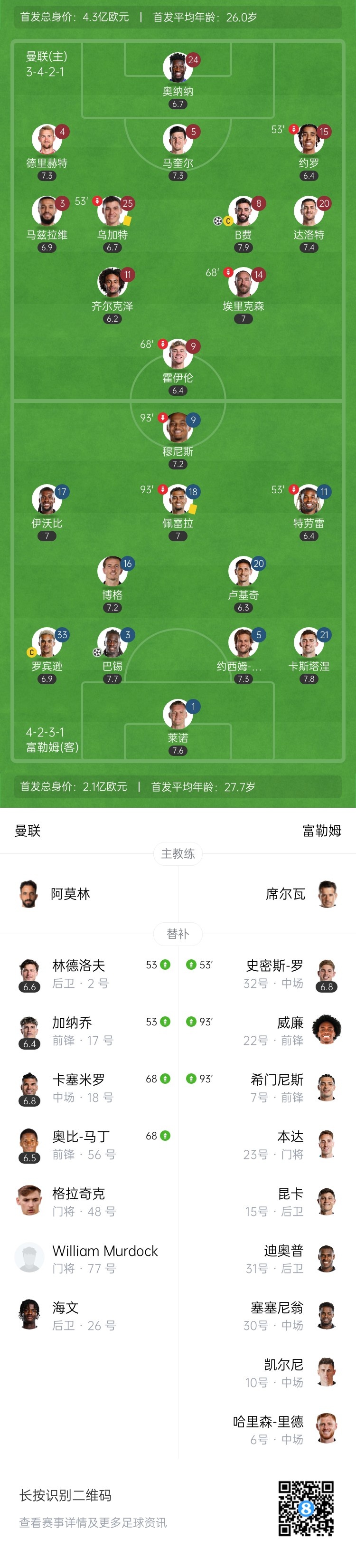 上半場傷停補時1分鐘,半場戰(zhàn)罷,曼聯(lián)暫0-1富勒姆。