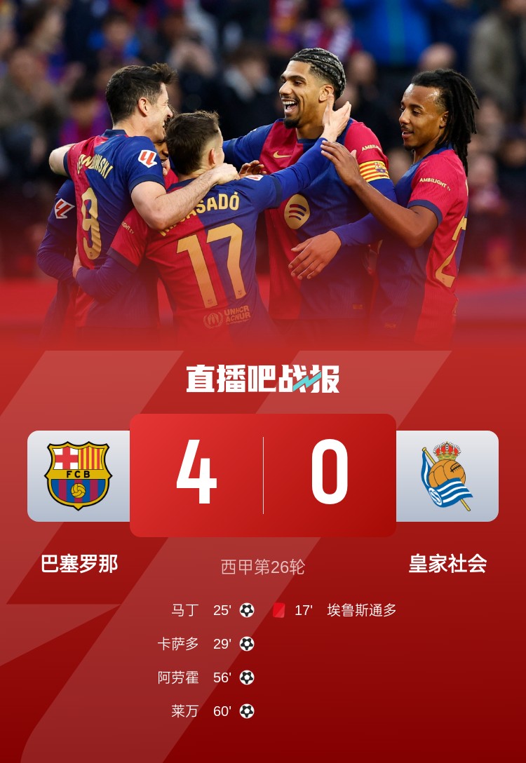 西甲第26輪,巴薩4-0橫掃十人皇家社會(huì),阿勞霍傳射,萊萬(wàn)進(jìn)球。