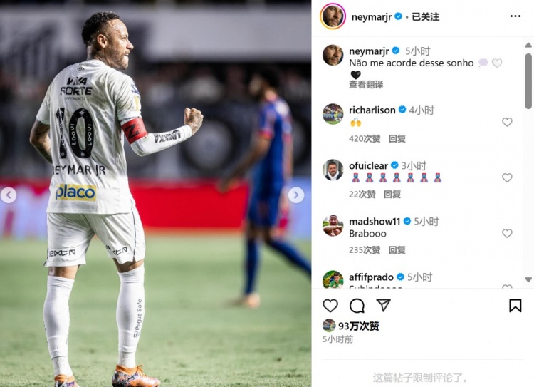加盟桑托斯7場(chǎng)3球3助,內(nèi)馬爾社媒曬照:別把我從夢(mèng)中叫醒