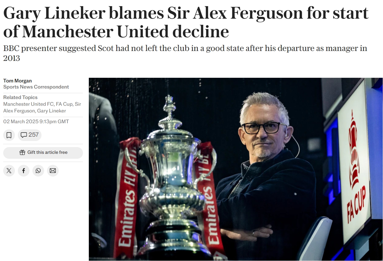 03月03日訊 英格蘭名宿、評(píng)論員萊因克爾在評(píng)述時(shí)表示,曼聯(lián)如今衰落的原因可以追溯到2013年弗格森的離任。