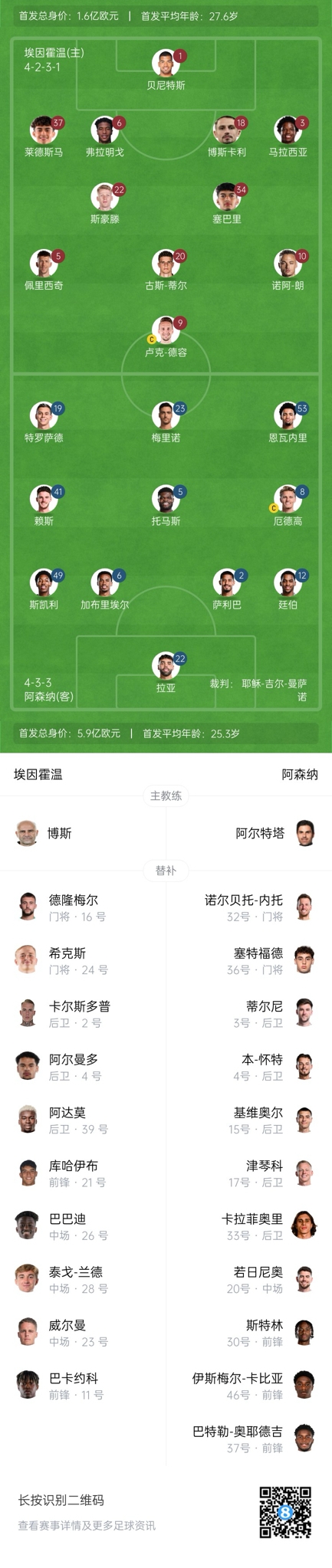 3月5日訊 歐冠1/8決賽首回合,埃因霍溫主場(chǎng)迎戰(zhàn)阿森納,賽前首發(fā)名單公布。