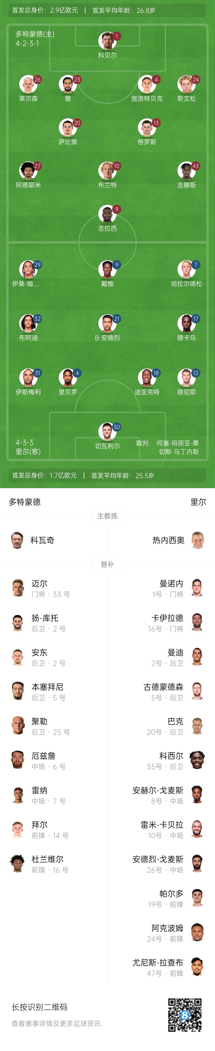 多特首發(fā):1-科貝爾、4-施洛特貝克、26-萊爾森、24-斯文松、23-埃姆雷-詹、20-薩比策、13-格羅斯、10-布蘭特、43-吉滕斯、27-阿德耶米、9-吉拉西