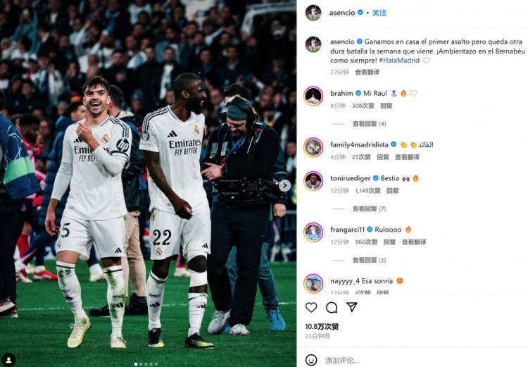 勞爾-阿森西奧配文道:“我們在主場贏下了首回合,但下周還會有一場鏖戰(zhàn)。伯納烏的氛圍一如既往地熱烈!”