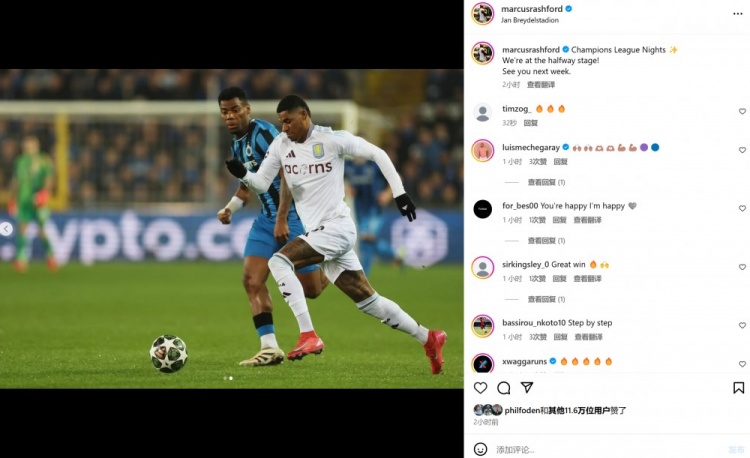 拉什福德社媒曬照:歐冠之夜,我們距離晉級還有一半路程!