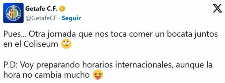 赫塔菲將于本周日下午14:00對(duì)陣馬競(jìng),而他們下個(gè)主場(chǎng)對(duì)陣萊加內(nèi)斯的比賽也是在下午14:00進(jìn)行。與此同時(shí),西甲聯(lián)賽宣布了第29輪的賽程,赫塔菲再次在下午14:00主場(chǎng)迎戰(zhàn)比利亞雷亞爾,俱樂(lè)部在社交網(wǎng)絡(luò)上調(diào)侃這一賽程。