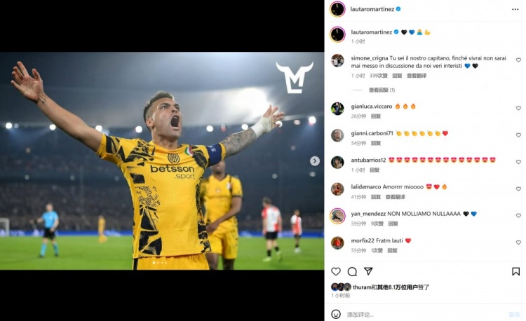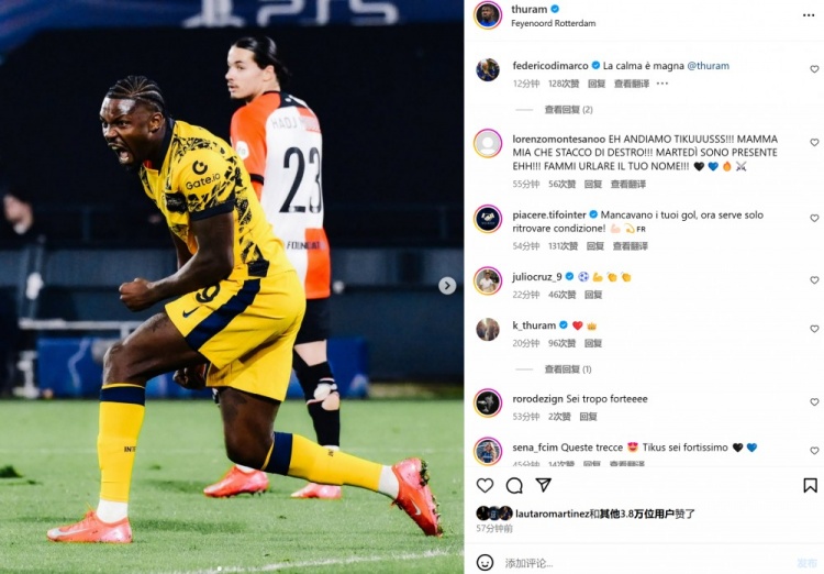 本場比賽勞塔羅與小圖拉姆雙雙破門,賽后兩人也分別在個人社媒曬出本場進球后怒吼慶祝的照片。