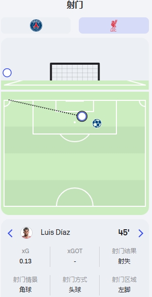 歐冠1/8決賽首回合利物浦1-0巴黎,全場紅軍只有兩次射門,一次形成進(jìn)球,另一次則是迪亞斯的頭球偏出。