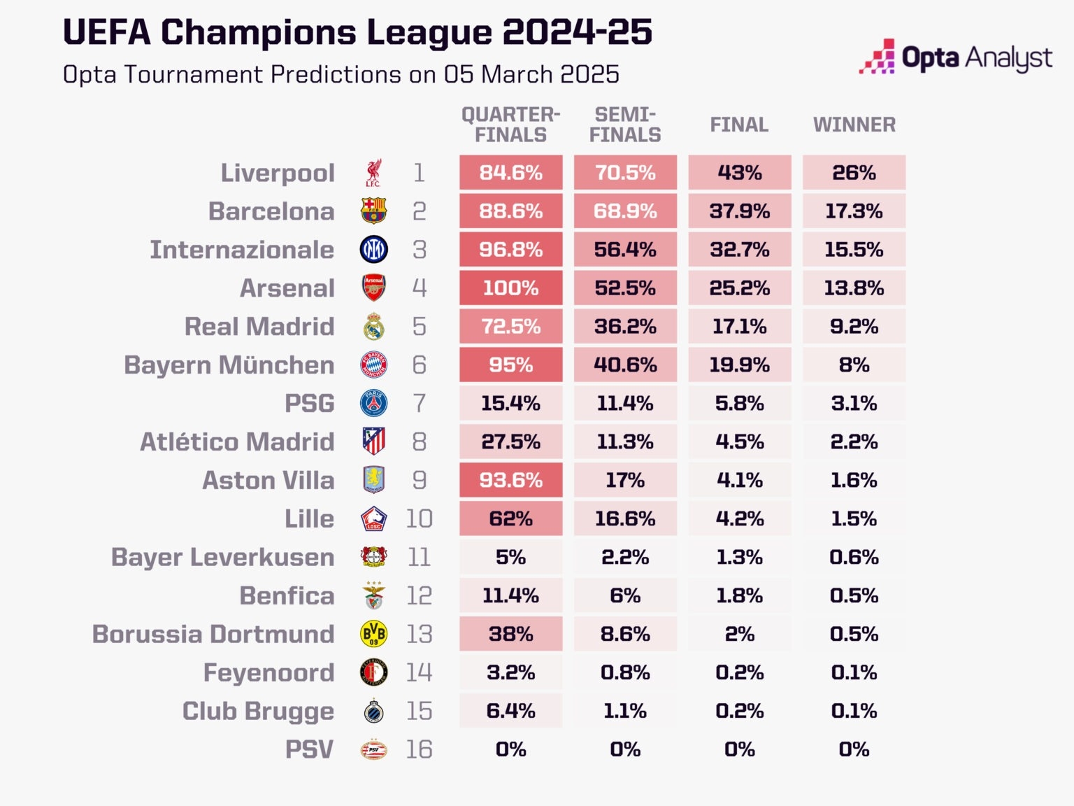 此外,Opta還計算了各支球隊晉級歐冠四強(qiáng)、決賽以及歐冠奪冠的概率。