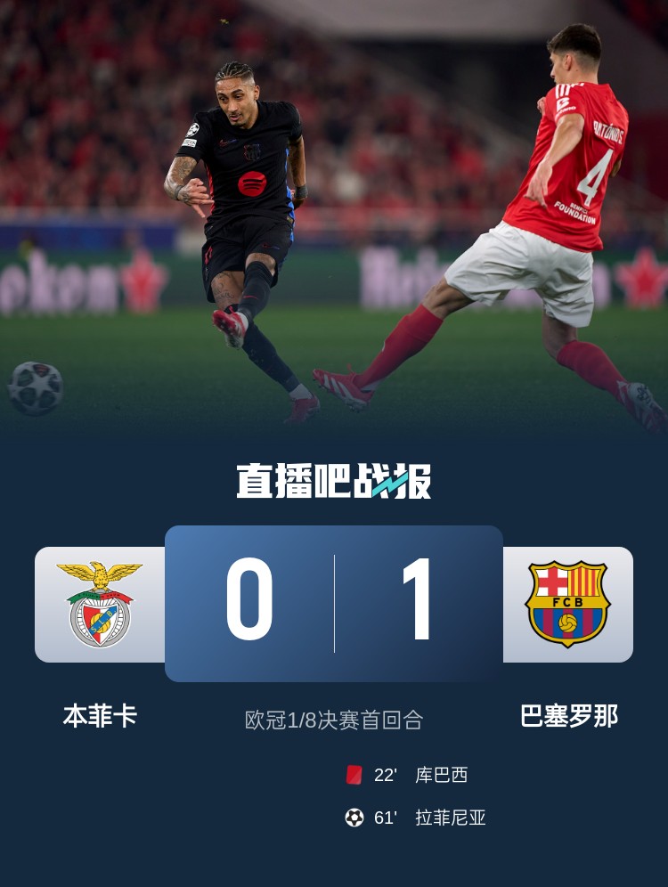 歐冠1/8決賽首回合,十人巴薩客場1-0本菲卡,庫巴西直紅,拉菲尼亞進(jìn)球。