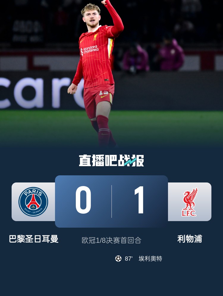 歐冠1/8決賽首回合,巴黎主場0-1遭利物浦絕殺,巴黎全場27次攻門一無所獲,利物浦1腳射正就進(jìn)球。